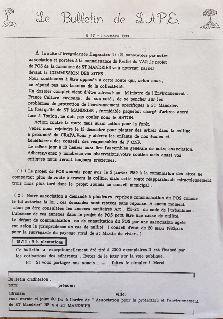 Pour bien informer les habitants soumis aux seules rumeurs, le Conseil d’Administration de l’APE prendra la décision en novembre 1990 d’éditer le bulletin spécial  N°27  qui sera diffusé dans toute les boites aux lettres du village par les adhérents placés sous la houlette de notre regretté Jean Pierre Poisson toujours discret mais ô combien efficace.